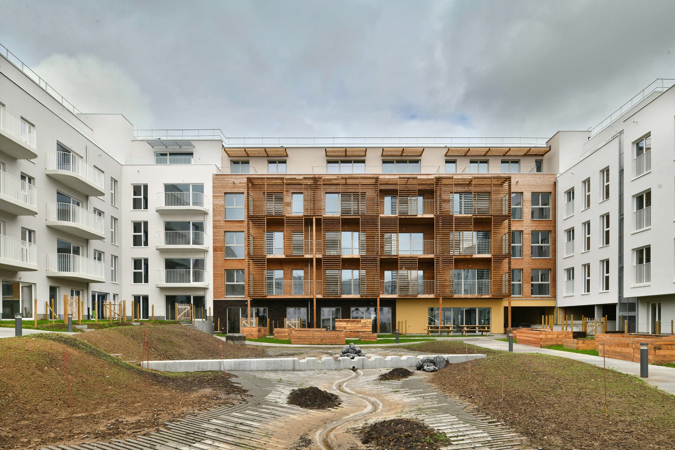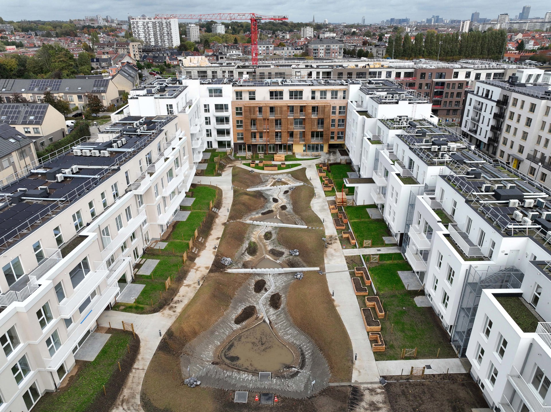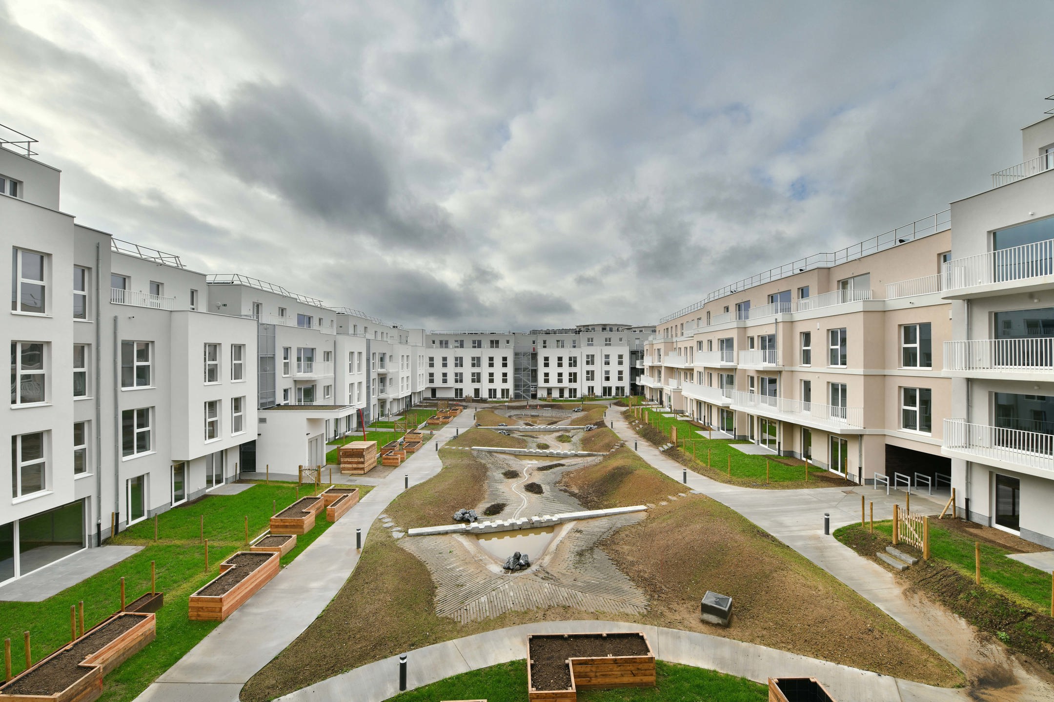 • Cœur d’îlot végétalisé avec rivière urbaine, jeux pour enfants, espaces de repos et zone potagère